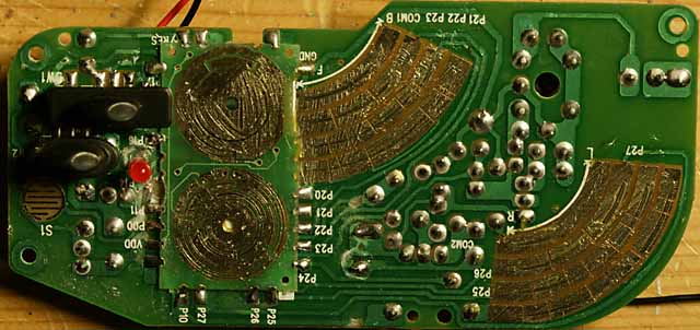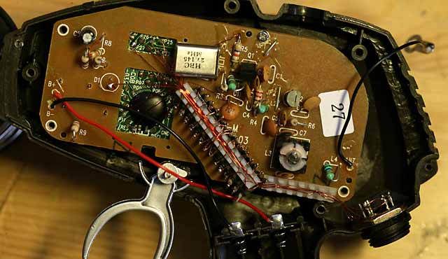 Danach empfiehlt es sich die Platine wieder einzusetzen. Dann wird der Controller eingesetzt. Die auf den Bildern gezeigte Stelle ist sehr günstig, da man nur kurze Verbindungen benötigt. Der Controller ist mit Super Kleber befestigt. In der anderen Gehäusehälfte sitzt an der Stelle, wo jetzt der Controller ist, eine Stütze. Diese muss entfernt werden, da sie sonst auf den Controller drückt und sich das Gehäuse nicht mehr schliessen lässt.