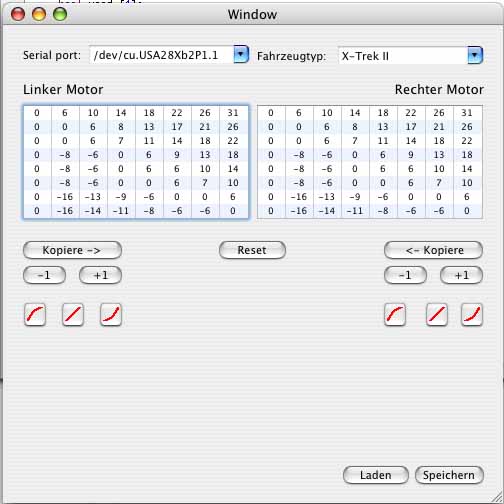 Kurven in denen der Motor normalerweise nicht verlangsamt wird (z.B. Linkskurven für den rechten Motor). Alle anderen Werte sind die Einstellungen für die Kombination von Lenkeinschlag und Geschwindigkeit in die Richtung in der der Motor normalerweise verlangsamt wird. Natürlich kann man dank der Tabellenwerte das Verlangsamen in ein Beschleunigen ändern.